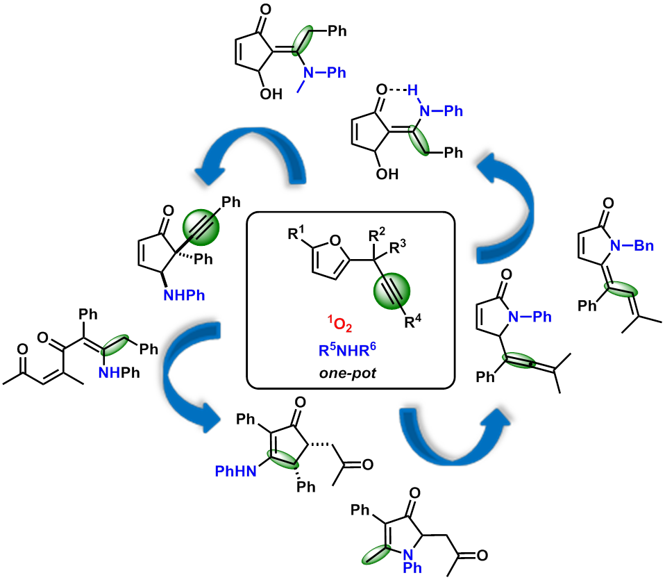 Furans are amongst the most versatile building blocks in organic synthesis. And, one of the major reasons is the ease with which the C-O bonds can be cleaved, creating an avenue for a large variety of poly(hetero)cyclic scaffolds depending on the substrate pattern of the precursors and the reactions conditions. Moreover, the interest for furans lies in the fact that their common precursors, furfural and 5-hydroxymethylfurfural, can be directly obtained from biomass derived carbohydrates such as cellulose and hemicellulose. In that respect, the photooxygenation of furans is particularly attractive as this transformation relies on the simple use of singlet oxygen 1O2, which can be generated from ground state triplet oxygen by visible light in the presence of trace amounts of a suitable photosensitizer (rose bengal, methylene blue, tetraphenylporphyrin, etc.). As part of our interest in the reactivity of furan derivatives, we investigated the reactivity 2-propargylfurans, which had never been explored with respect to photooxygenation. and demonstrated that they could enable access to a large range of nitrogen-containing cyclopentenones and related compounds through a subtle design of substrates.