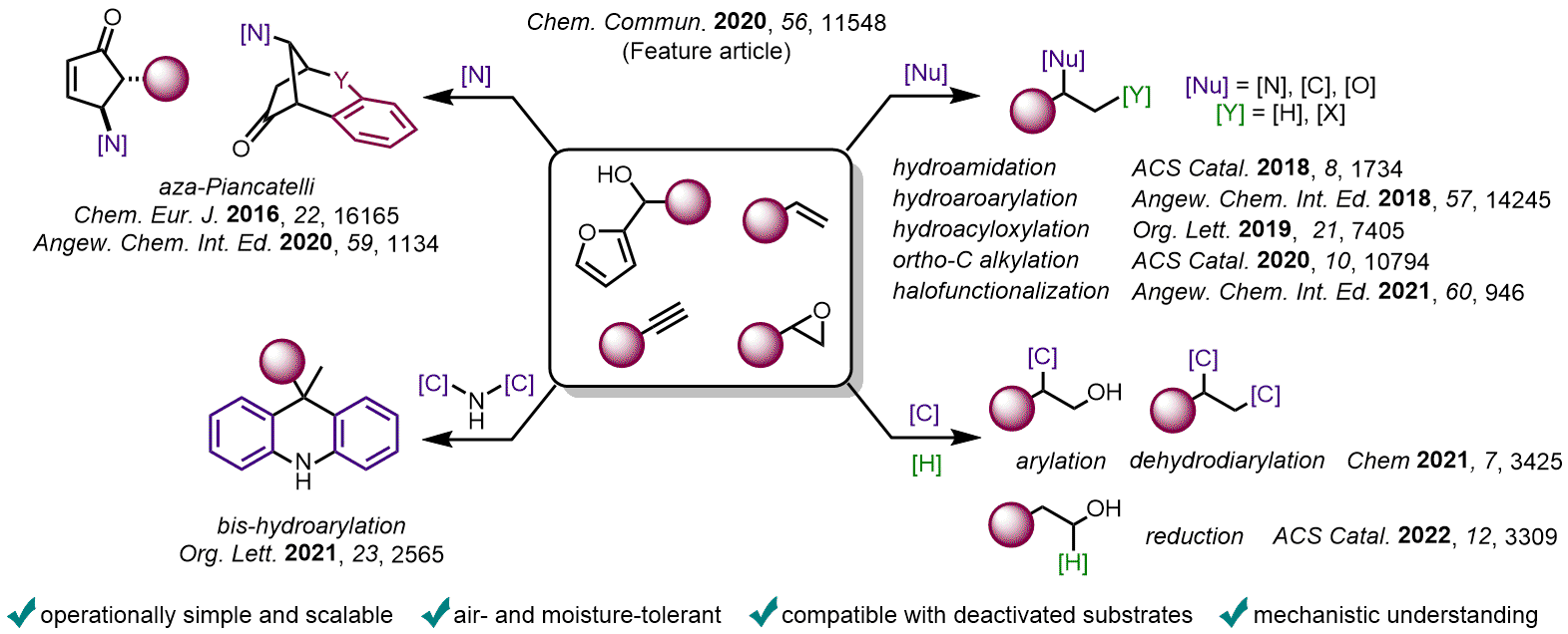 Moreover, due its strong H-bond donor ability, HFIP has the capacity to facilitate the release of Lewis acids trapped by unwanted coordination to the substrate (or the product), allowing the catalytic process to turn over. In the past years, we demonstrated that such type of combination in catalysis was not only an elegant concept but could be used to access original frameworks of interest and, thus, pave the way for potential applications in industry, including medicinal and materials chemistry. Some key examples are presented below. Regarding this topic, DFT  computations have also been carried out by my collaborator – Pr. Vincent Gandon – to gain a better understanding of how HFIP operates.