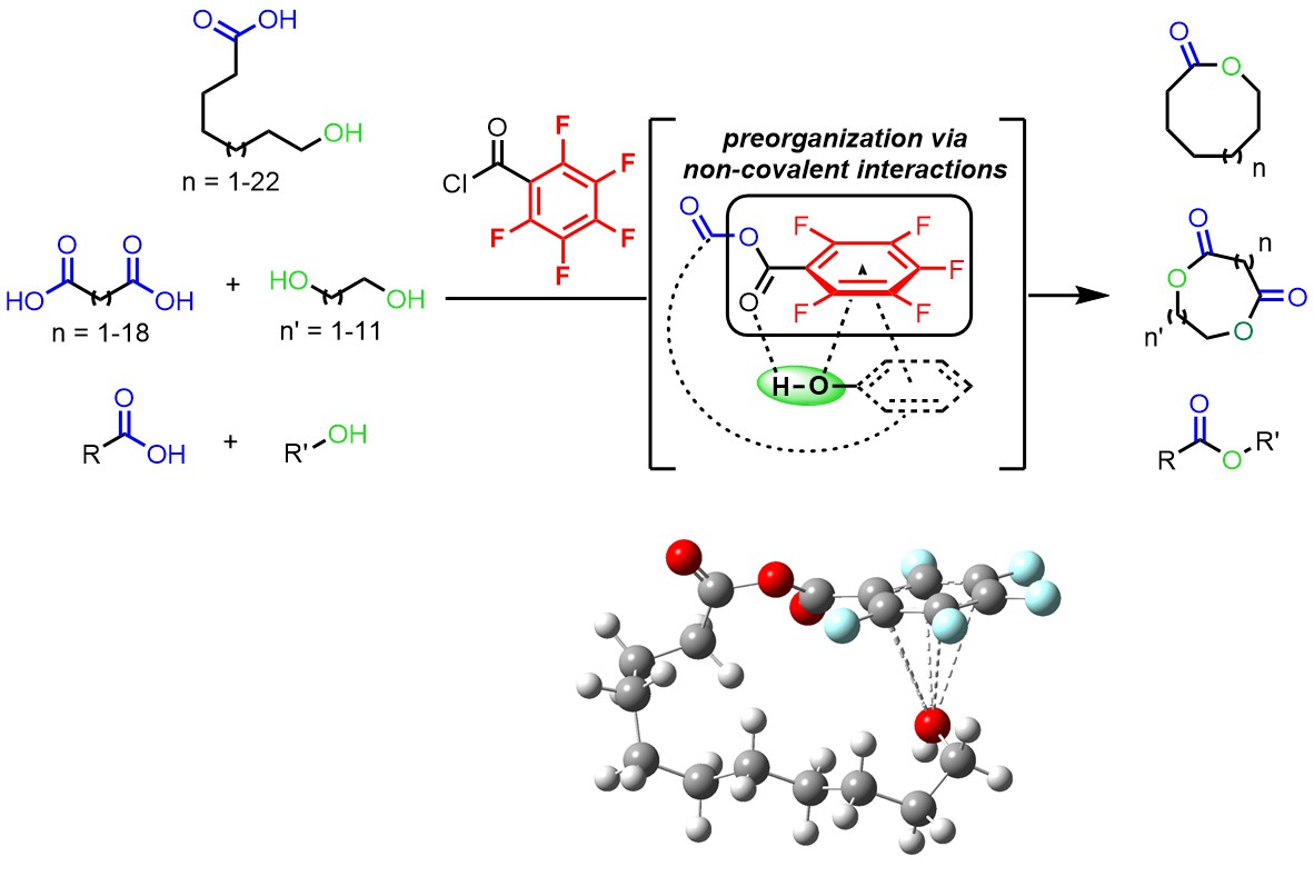 We thus developed a new strategy for the macrolactonization of seco-acids and diacids that efficiently generates a vast library of macrolactone, macrodiolide and ester derivatives, relying on the use of pentafluorobenzoyl chloride as an activating agent. This approach is a step-change advance over the classic macrocyclization strategies reported by Yamaguchi and Shiina, both in terms of practicality and in terms of concept. The key is that the use of a pentafluorophenyl group which allows the pre-organization of the substrate – via lone pair-pi and pi-pi interactions – while increasing the reactivity of the mixed anhydride intermediate, enabling for the first time not only the macrolactonization of seco-acids and the macrodilactonization of diacids with diols but also esterification reactions. In the current economic context, this method does not require the use of any transition metals but an inexpensive activating agent and is a user-friendly tool that allows to remove all the by-products by simple aqueous treatments for a more sustainable chemistry. In addition, to rationalize the superior reactivity of the pentafluorobenzoyl group, we performed extensive mechanistic studies, including kinetic studies, low-temperature NMR and DFT computations in collaboration with Dr. Ilaria Ciofini.